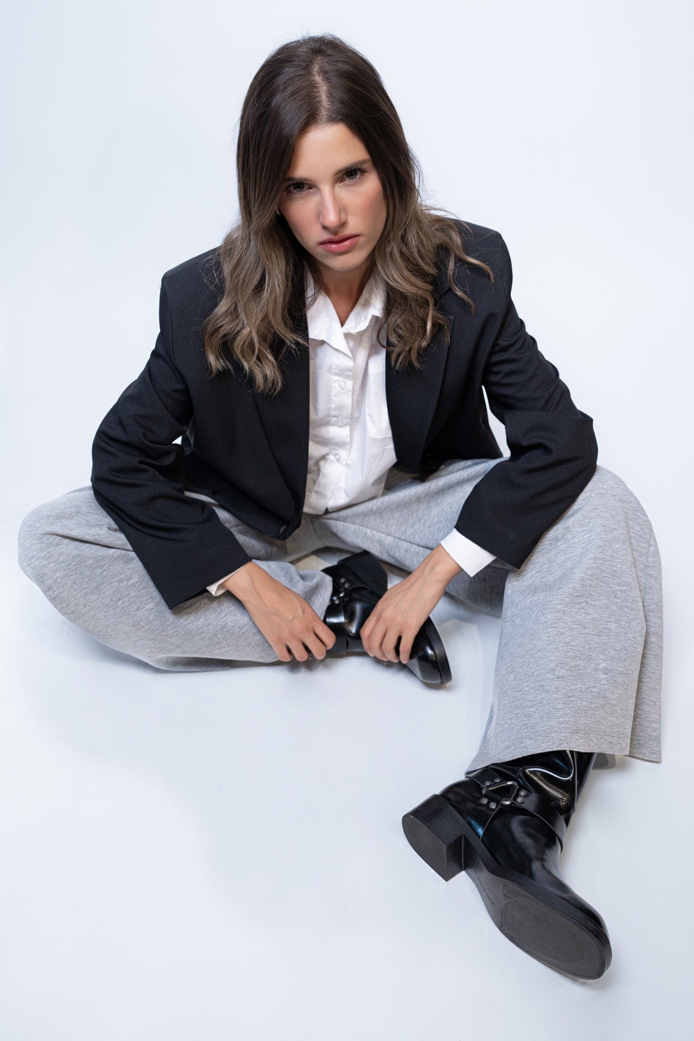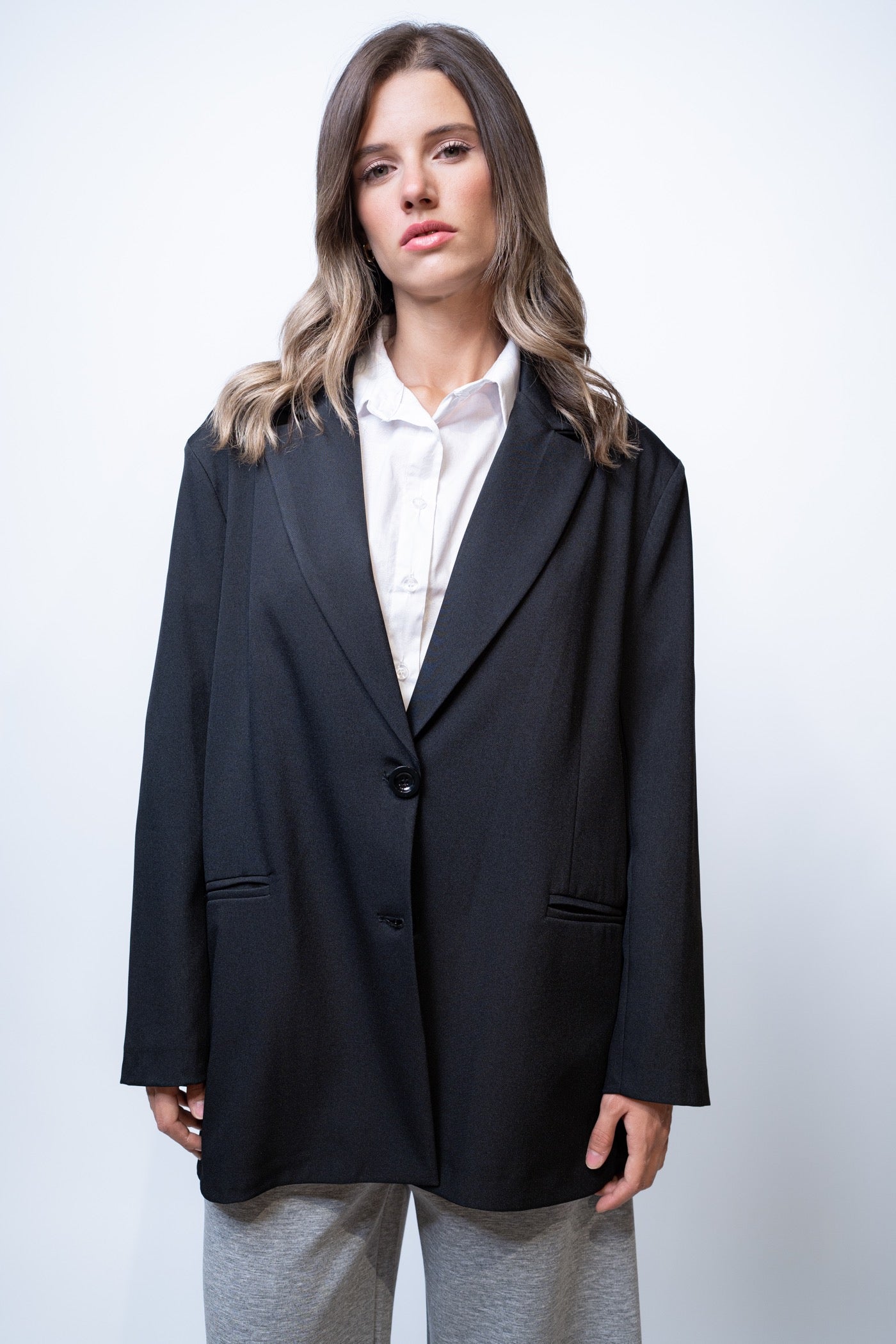Blazer oversize con revers e chiusura frontale con due bottoni. Bottoni al fondo manica