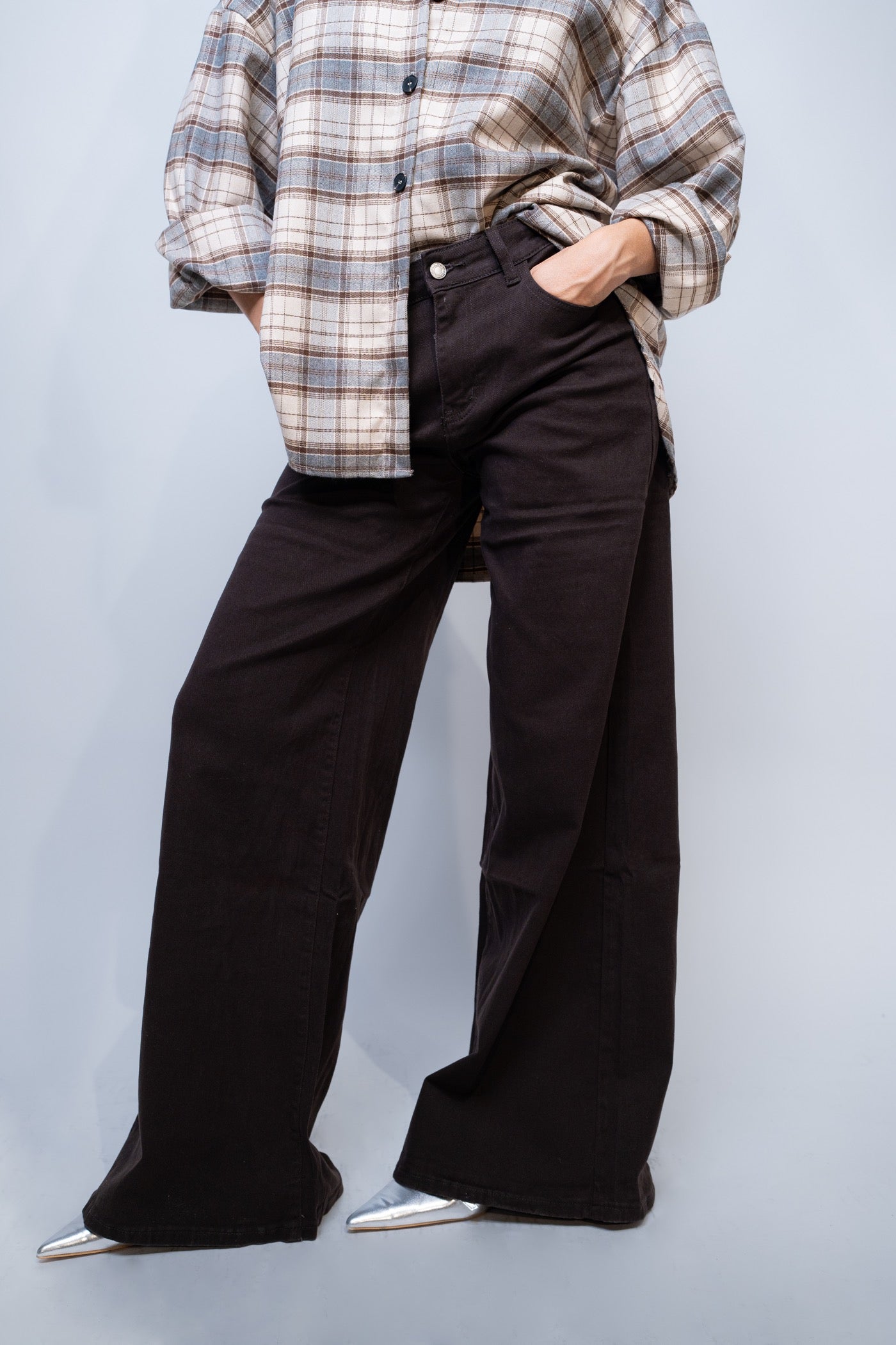 Jeans wide leg con vita regolare, chiusura frontale con bottoni e zip, con tasche.